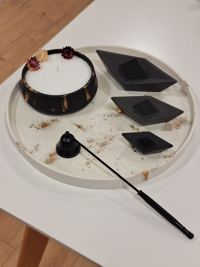 Un très grand plateau rond étoilé d'or accueille une flotte de bateaux, accompagnés du petit bol Épure à remplir de bougie perlée et d’un éteignoir élégant.