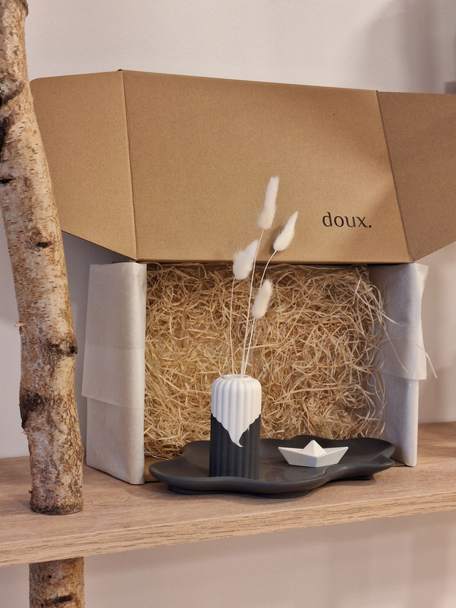 Un nuage, un petit bateau origami, un vase délicat : trois pièces qui s’accordent par leurs courbes et leurs textures.